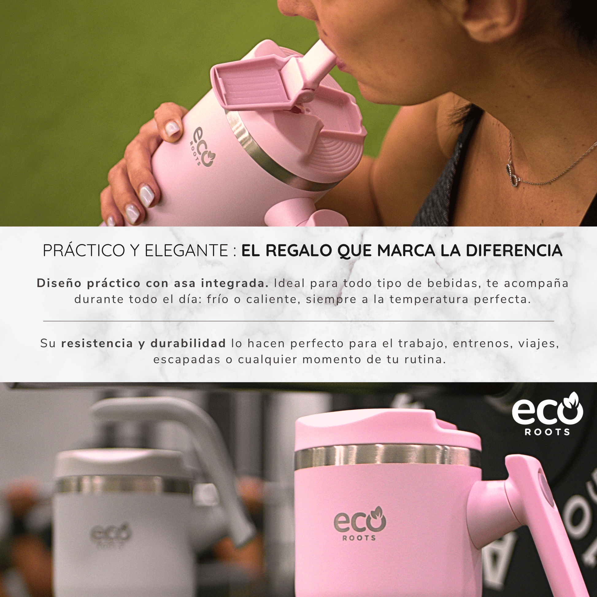 ✦ Asa giratoria 360º: Un extra exclusivo de ECOROOTS que marca la diferencia. Su asa se adapta a ti, permitiéndote llevarla fácilmente en la mochila, bolso o en el portabotellas de tu bici.