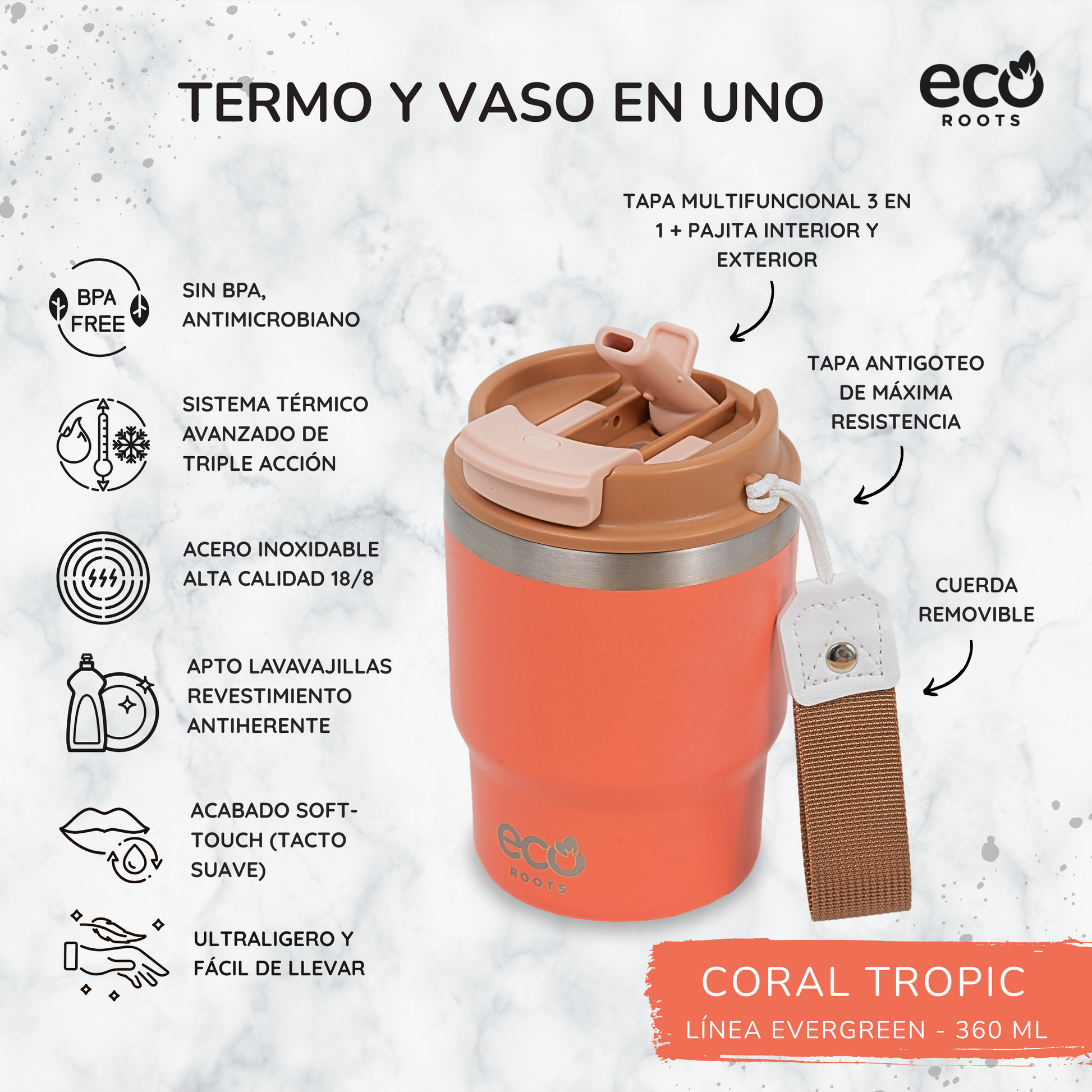 ✦ Portabilidad óptima y funcional: Incluye una correa removible para facilitar el transporte y una tapa de triple funcionalidad, perfecta para disfrutar de té, café o cócteles en cualquier ocasión.